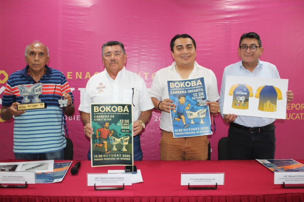 Mérida, Yucatán | 26 de agosto de 2025.- Con recorridos de 5 y 10 kilómetros, el próximo 12 de octubre se realizará la carrera “Bokobá, el origen de las sillas confidentes”. La presentación estuvo a cargo de los organizadores Johnny Martín Huchim Uitz y el profesor José Ventura Boldo, quienes destacaron la expectativa de una amplia participación de la comunidad corredora.
