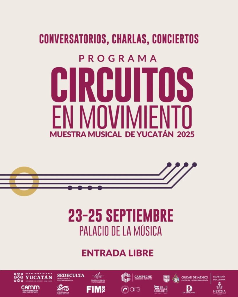 Mérida, Yucatán | 18 de septiembre de 2025.- Con el propósito de descentralizar la oferta cultural y dar mayor visibilidad a los creadores musicales del estado, este martes 23 de septiembre dará inicio Circuitos en Movimiento. Muestra Musical de Yucatán 2025, un programa que combina conciertos, showcases y rondas de negocios dirigidas al sector.
