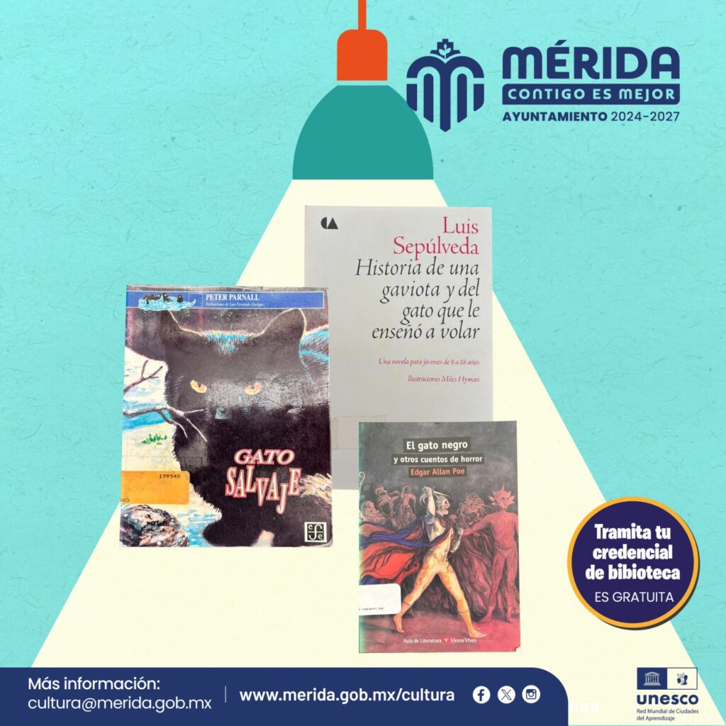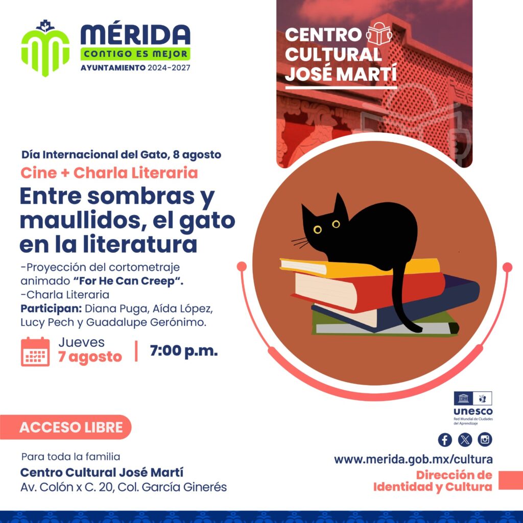 El encuentro “Entre sombras y maullidos, el gato en la literatura” es este jueves 7 de agosto y contará con la presencia de Diana Puga, Aida López, Guadalupe Gerónimo y Lucy Pech, quienes dialogar sobre cómo los gatos se deslizan entre páginas, autores y géneros, dejando una huella silenciosa pero poderosa en el imaginario literario.