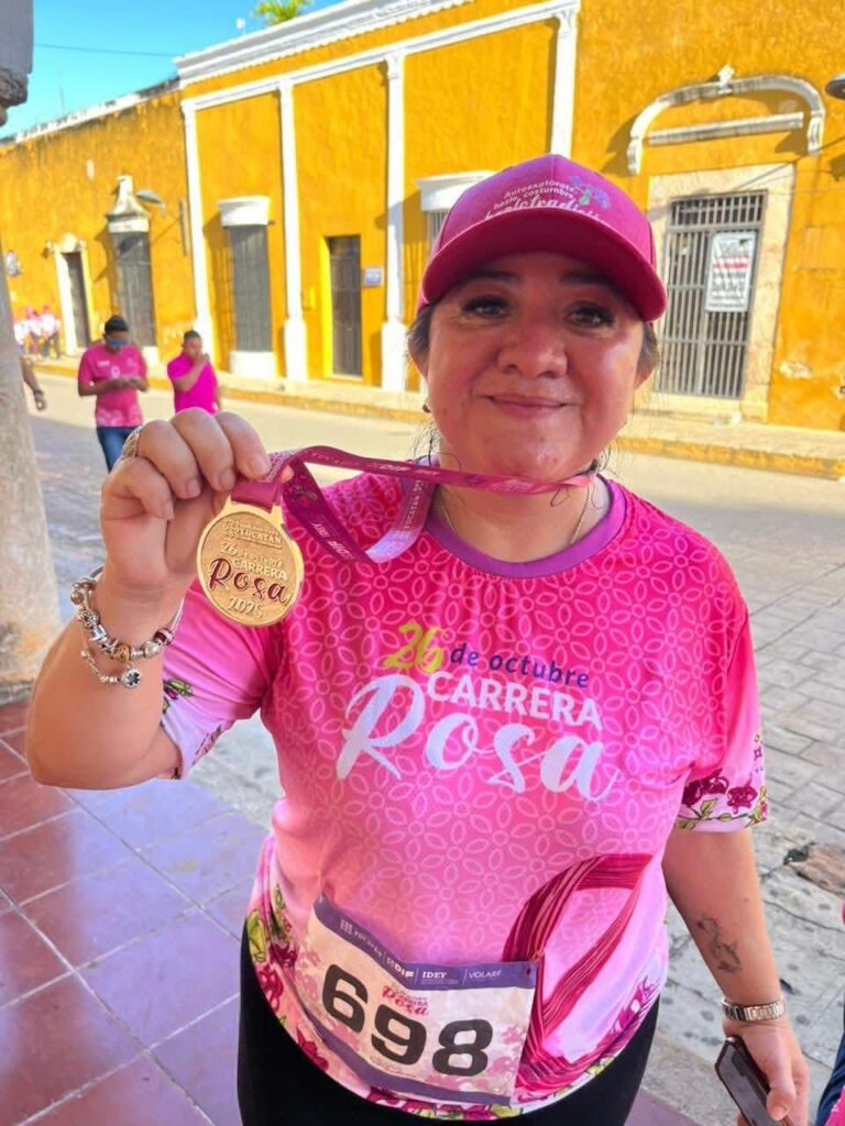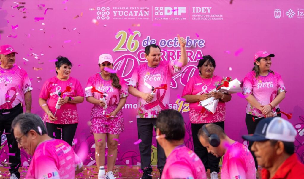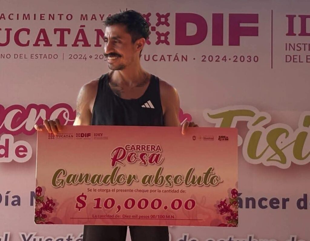 Izamal, Yucatán | 26 de octubre de 2025.- Izamal se vistió de rosa este domingo con motivo del Mes de la Lucha contra el Cáncer de Mama al celebrarse la Carrera Rosa 2025, que reunió a más de 2,500 participantes en un ambiente lleno de solidaridad y compromiso con la salud. En la competencia de 10 kilómetros, el gran ganador fue Fernando Saavedra de León, quien se impuso con un tiempo de 32 minutos y 33 segundos, mientras que en la rama femenil libre la vencedora fue Abigail Cabrera Martínez con un registro de 36 minutos y 47 segundos. Ambos atletas recibieron un reconocimiento especial y un premio de 10 mil pesos por su destacada actuación.