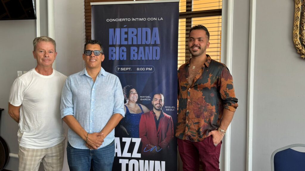 La presentación oficial de “Jazz in Town” fue encabezada por el Director de la Mérida Big Band, Rabiar Pucheux, acompañado de los cantantes Robert Young y Miguel Seguí, quienes compartieron detalles de lo que el público podrá disfrutar en esta nueva propuesta musical.