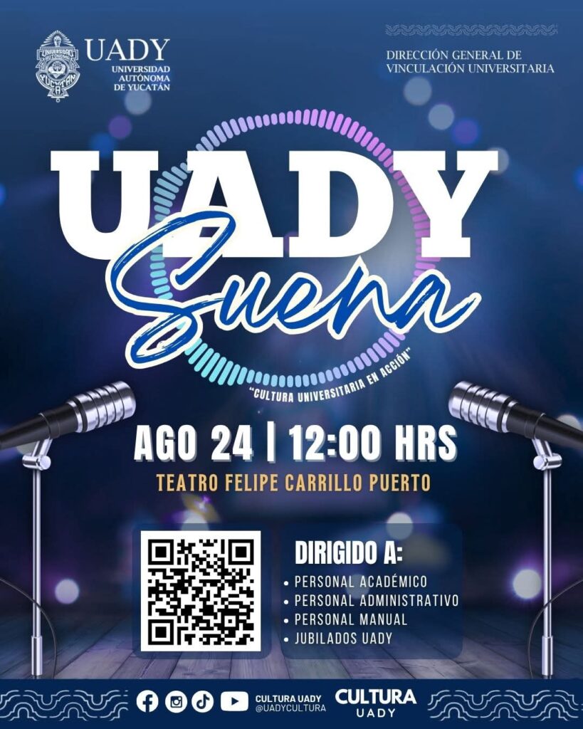 Mérida, Yucatán | 11 de julio, 2025.- Con el objetivo de promover la expresión creativa, impulsar el talento musical universitario y fortalecer la convivencia dentro de la comunidad, la Universidad Autónoma de Yucatán (UADY), a través de su Coordinación de Cultura, presenta dos convocatorias: Indie UADY y UADY Suena.