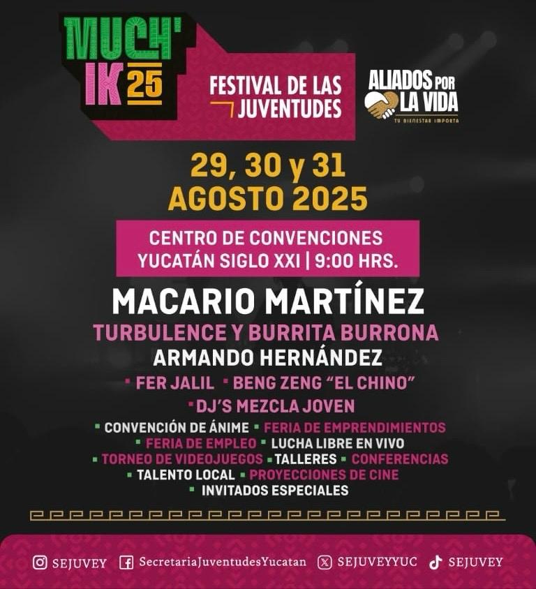 Mérida, Yucatán | 5 de agosto de 2025.- Arte, ciencia, deporte y muchas experiencias más se unen este agosto para celebrar a las y los jóvenes de Yucatán con Much’Ik, el mes que impulsa su talento, participación y bienestar. Más de 60 actividades llegarán a todo el estado, fomentando el emprendimiento, la salud integral y la participación social, con una agenda creada junto con las juventudes.