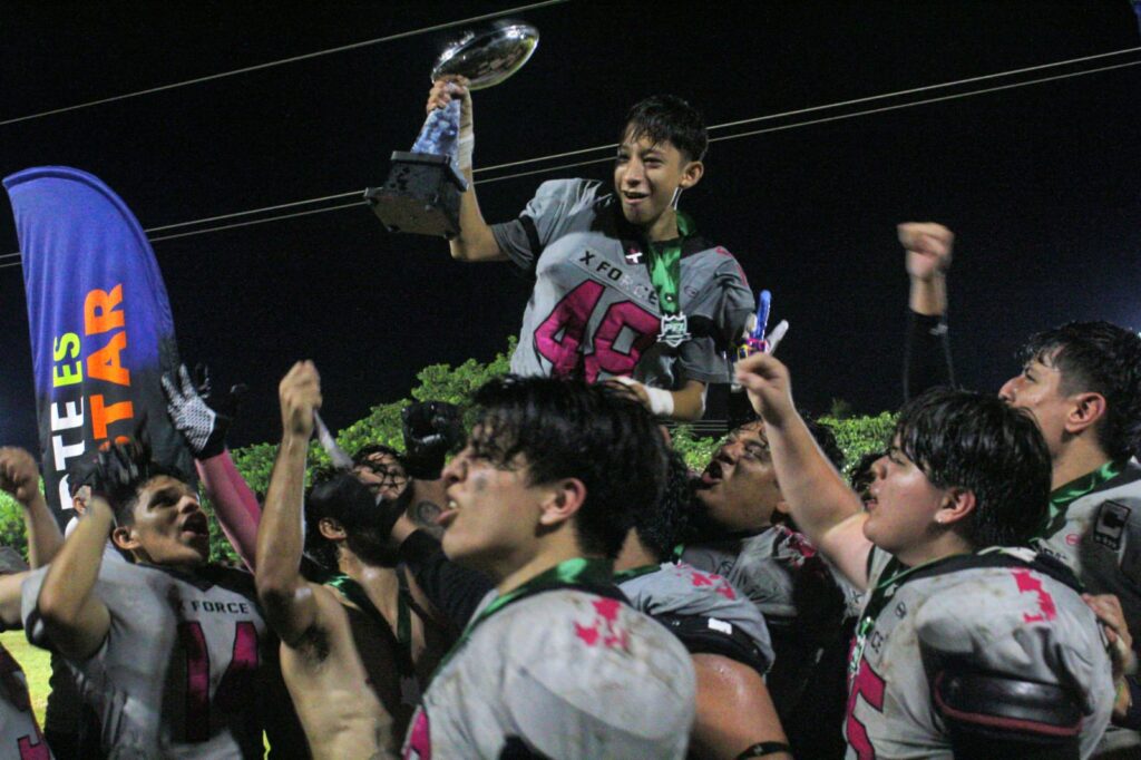Mérida, Yucatán | 20 de octubre de 2025.- Con una ofensiva demoledora y un juego lleno de energía, X-Force se proclamó campeón de la I Edición de la Liga Peninsular de Football League, al vencer 29-6 a los Raptores, en una final vibrante disputada en la Unidad Deportiva Raptors.