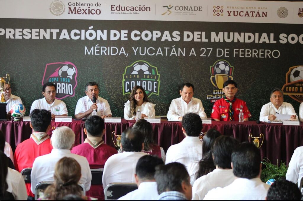 Mérida, Yucatán | 27 de febrero de 2026.– Autoridades estatales presentaron las seis Copas que integrarán el Mundial Social 2026, como parte de las actividades relacionadas con la Copa Mundial de Futbol 2026.